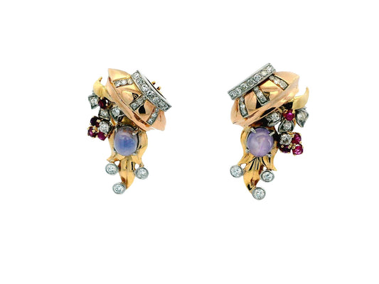 14K Rose Gold Retro Star Sapphire, Diamonds & Rubies Basket Form Earrings.
