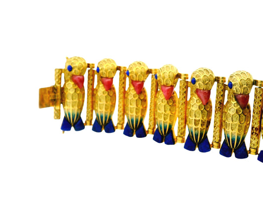 18k Parrot Rhodonit Beaks & Lapis Feet /Eyes Blue Enamel Bracelet