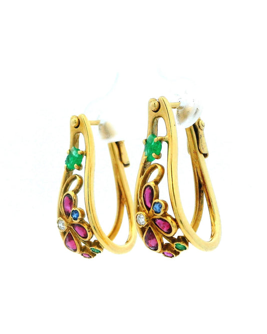 18K Gold Tapered Wire Carved Ruby, Sapphire & Diamond Earrings