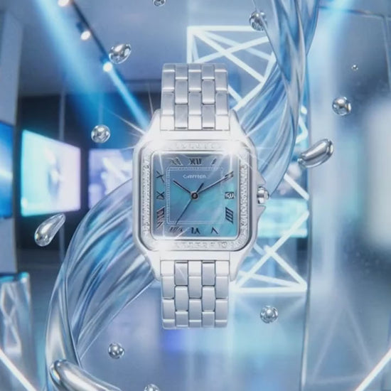 The dial features a beautiful blue mother of pearl finish, paired with delicate white gold hands and Roman numeral hour markers, which enhance its refined look. Minute markers are included on the inner dial for added precision.